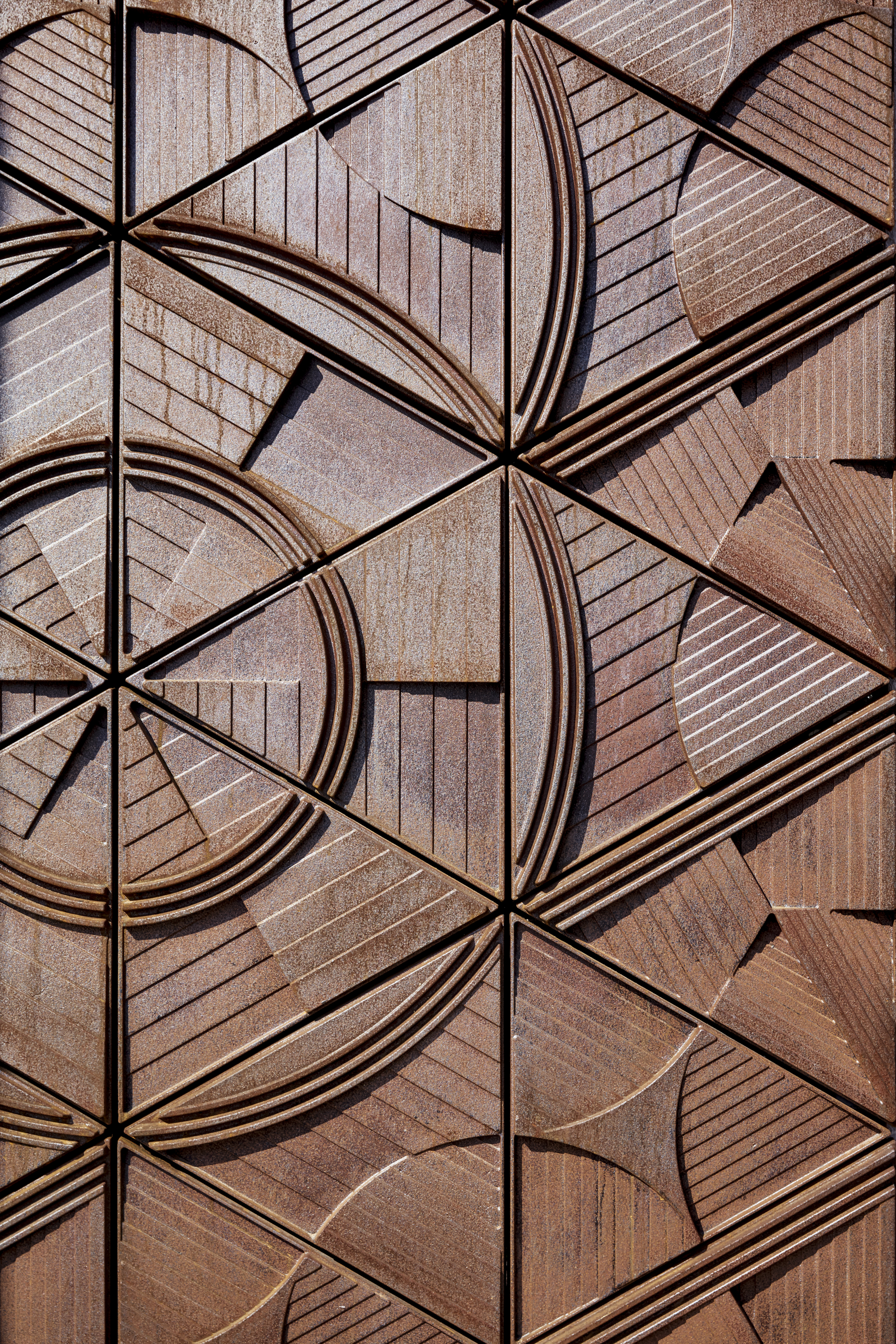 The building consists of a seven-story rectangular block divided into a room wing with a perforated façade and the