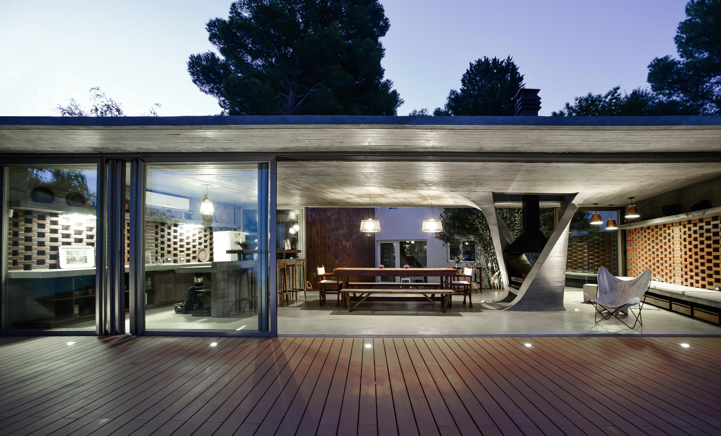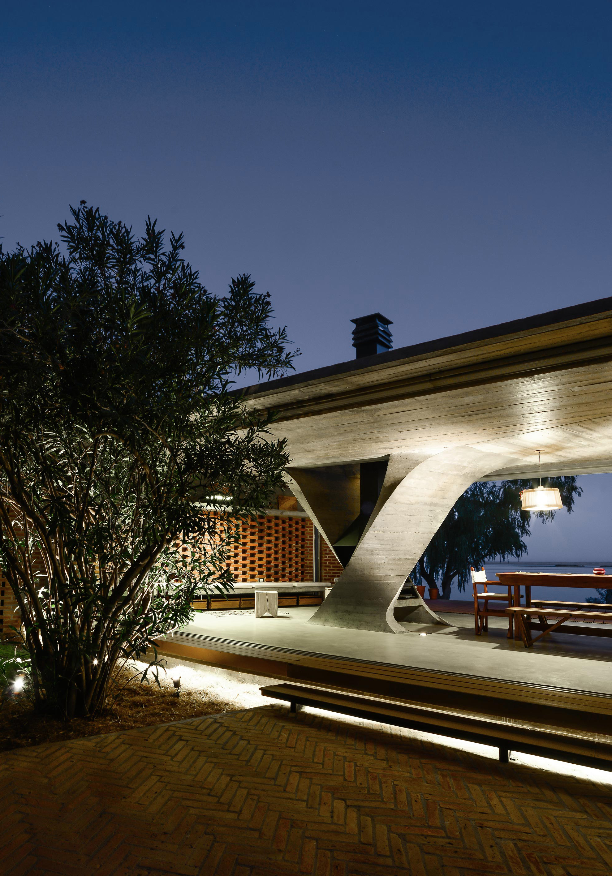 One Column House researches on the multiple performances the architectural element of a column could achieve beyond its structural capacity. Firstly, it is an element that marks a central place by integrating a fireplace, while articulates the program by organizing the different functional spaces around it and orienting site-specific vistas. At the same time, it stores the fireplace logs and works as an infrastructural device, where the rainwater pipes are embedded within the twisted shear walls while opening the concrete roof enabling natural zenithal light come through.